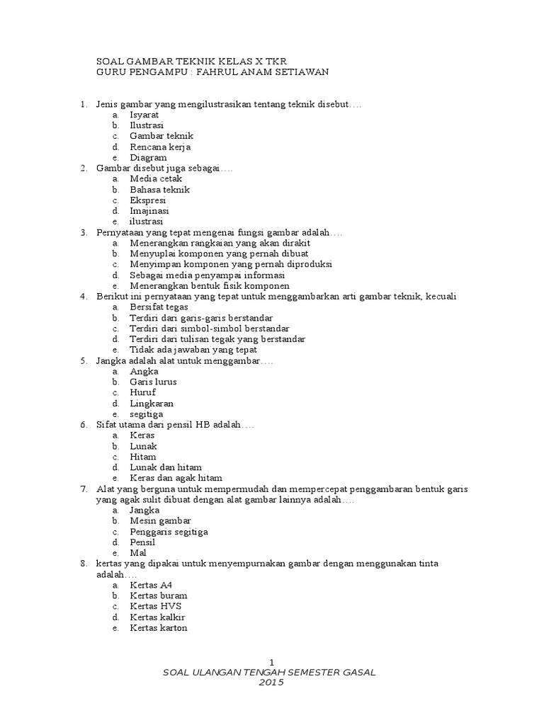 Soal Produktif Teori Kejuruan Tsm Dan Tkr Gambar Teknik Otomotif Kelas X Semester Ganjil Dunia Smk